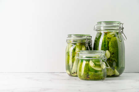 Healthy probiotic vegan food. Three glass jars of homemade fermented cucumbers with garlic, dill and pepper. Light gray background. Copy space.