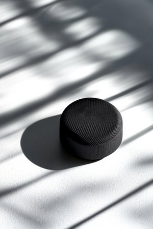 close up view highlights the textured surface and embossed logo of a hockey puck beautifully positioned against a white background with soft shadows and bright illumination.