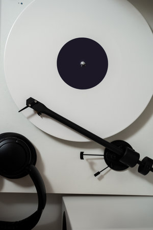 33 RMP white vinyl records on the needle player with headphones acoustics. Listen to music with Hi-Fi sound at the speaker system.