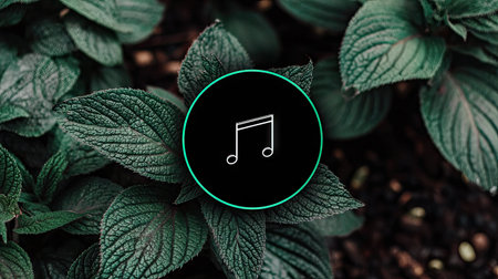 A musical note icon is centered against a background of green leaves. The leaves create a natural, textured aesthetic, with variations in shades of green. This could be used for various projects, including music-related websites, social media content, and design templates.