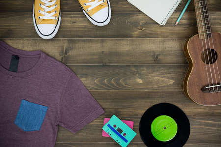 Wooden table of music composer, ukulele, notebook, audio cassettes, microphone, tape recorder and clothes with copy space. flat lay