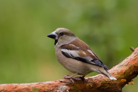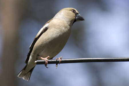 Hawfinch bird Coccothraustes coccothraustes sitting on a wood