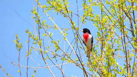 Rose-breasted Grosbeak (Pheucticus ludovicianus) also known as a Cut-throat perched on a tree branch during spring. Selective focus, background blur and foreground blur.