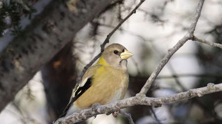 A beautiful Female Evening Grosbeak - Coccothraustes vespertinus - perched on a branch, Quebec, Canada
