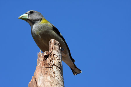 Evening Grosbeak (Coccothraustes vespertinus)female sitting on a old tree.