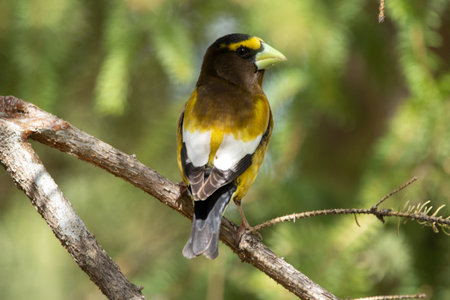 A vibrant male yellow Evening Grosbeak perches gracefully on the spruce tree with green needles in spring backyard garden, displaying its bold plumage and strong beak.