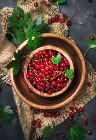 Red currant in wooden bowl on canvas napkin, rustic style, summer food background, top view