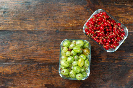 Summer berries in glass plates on a worn brown wooden background - raspberries, gooseberries and red currants.