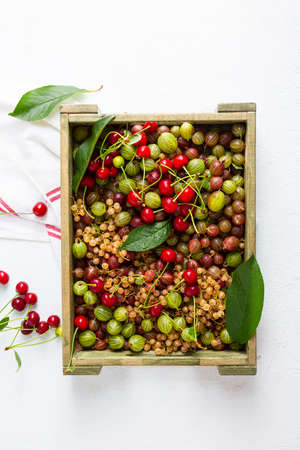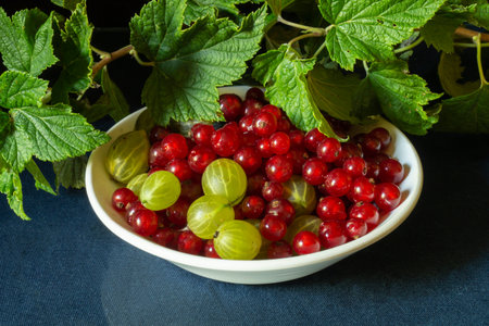 The Red currant with gooseberry in white plate on background green sheet. The Still life with berry on black. Ripe fruits at year term of time