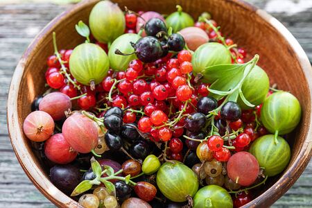 Pile of ripe berries in a clay pot, blackcurrant, redcurrant, gooseberry, blackberry. Sweet and sour vegeterian diet