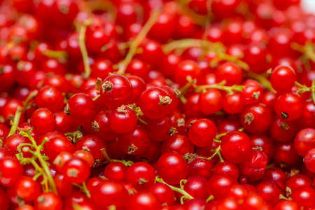 Close-up of multiple cardboard boxes filled with fresh ripe red currant berries at farmers market, small fruits with stems, healthy nutrition and organic produce concept