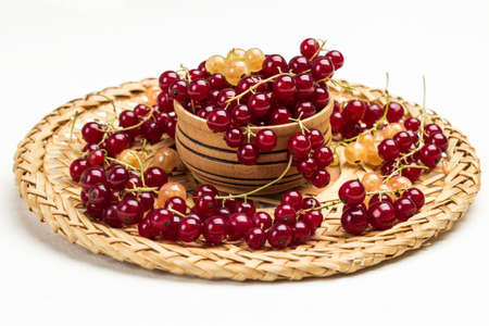 Red currant in a wooden plate, and scattered next to the plate, space for text, top view.