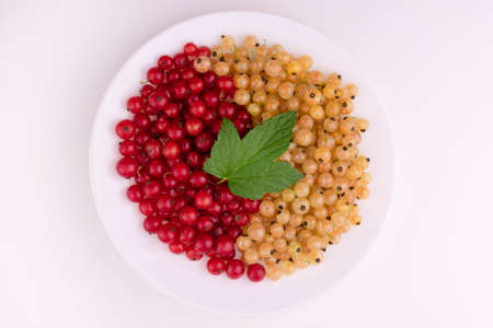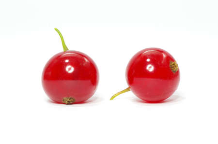 Sprigs of red currants on white. Berry background. Top view. Copy space