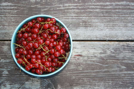 Fresh ripe red currants on rustic wood background. Bowl with natural ripe organic berries with peduncles on old weathered grey wooden table, top view with copy space