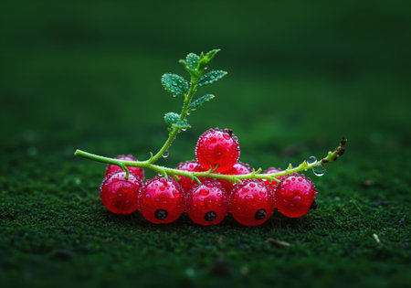 Vibrant red currant berries, still attached to their green stem, are covered in sparkling dew drops, highlighting freshness and natural beauty.