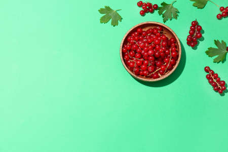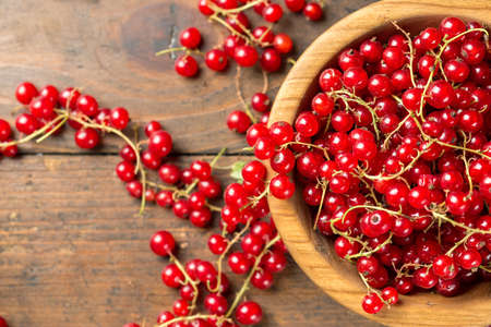 Red currant in a wooden plate, and scattered next to the plate, space for text, top view.