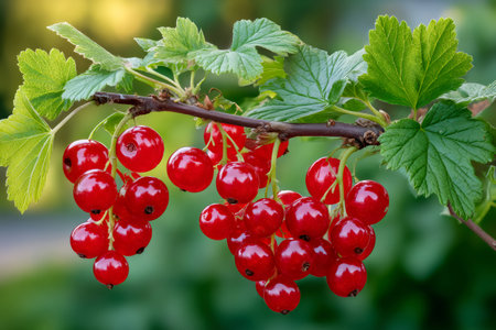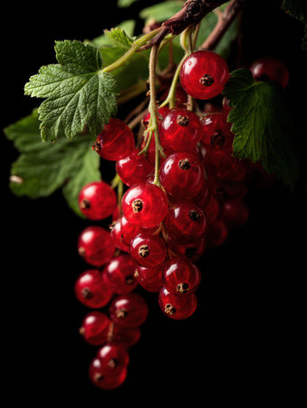 A stunning display of fresh red currants on a branch showcases their vibrant color and juicy texture, perfect for enhancing culinary creations or healthy eating.