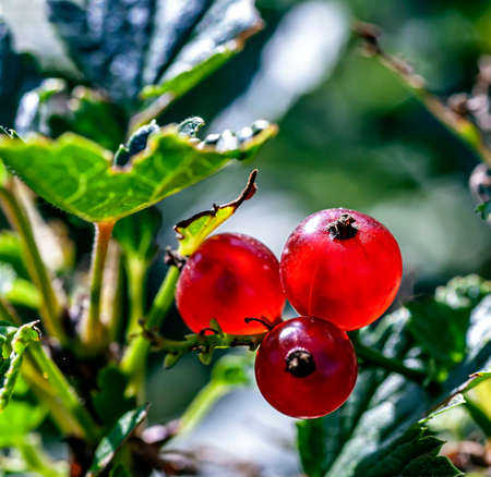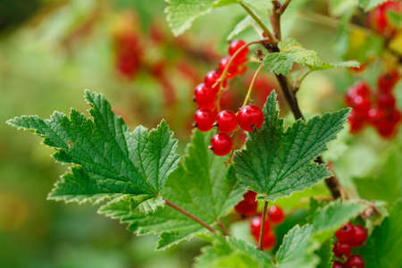 Macro of perfect red ripe redcurrants (ribes rubrum) on the branch between green leaves with blurry background. Taste of summer