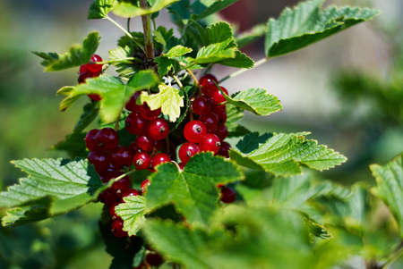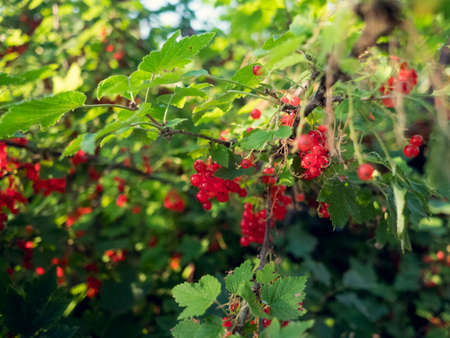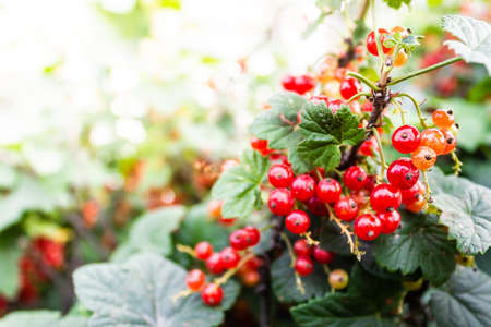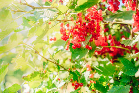 Red currant berries and green leaves in the autumn garden on a sunny day