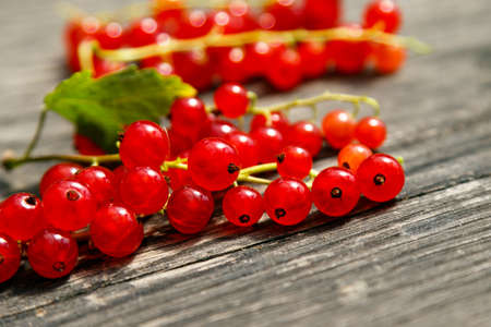Red organic currant berries on old rustic wooden table