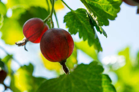 Perfect fully and partly ripe redcurrants (ribes rubrum) on the branch between green leaves in the sunlight with blue sky background. Taste of summer