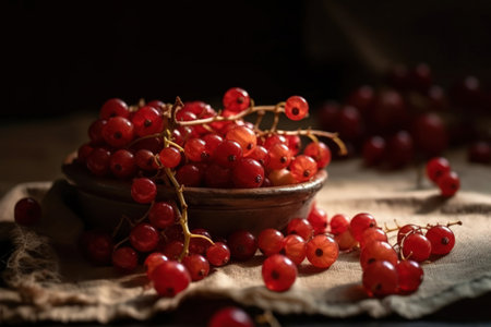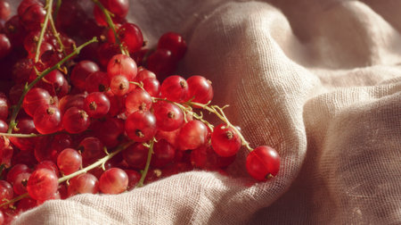 A beautiful arrangement of fresh red currants resting on soft linen cloth captures the essence of nature's bounty, perfect for culinary inspiration or artistic use.
