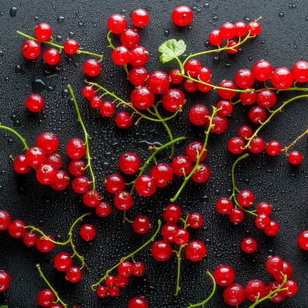 This image showcases a cluster of fresh red currants glistening with moisture, ideal for food enthusiasts, health blogs, and culinary creatives seeking vibrant visuals.