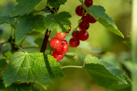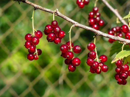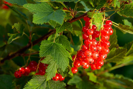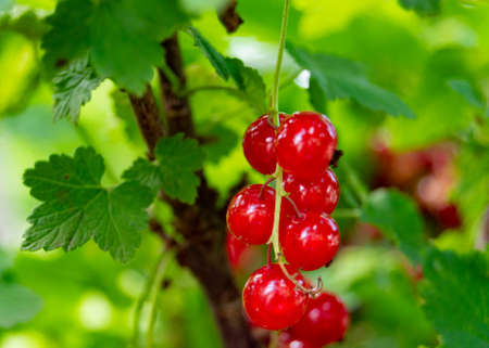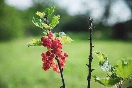 Ripe redcurrant berries are ready to be picked. Juicy berries on a branch in the garden.