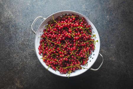 Ripe red currant in a colander. Top view.