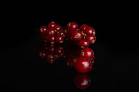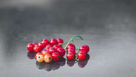 red currants on black granite background. reflection on polished granite surface. berries ready to eat, healthy food. Good fruits for soft drinks and vine making.