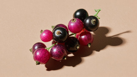 A delicate arrangement of fresh black currants resting on a soft pink surface, illuminated by gentle natural light that showcases their glossy texture and rich colors.