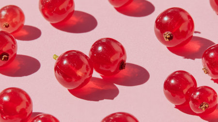 A close-up view of fresh red currants arranged artistically on a pink surface. The vibrant color and natural light create a stunning visual perfect for culinary and decorative uses.
