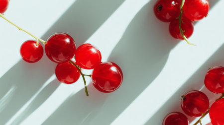 Vibrant red currants arranged beautifully on a light surface, casting soft shadows under daylight. Ideal for healthy recipes, culinary art, and food photography.