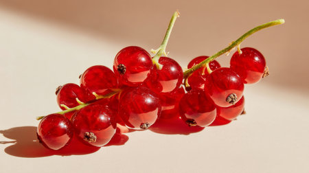 A close-up view of fresh red currants resting on a branch, showcasing their vibrant color and glossy texture against a soft beige background. Perfect for food-related themes.