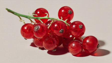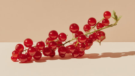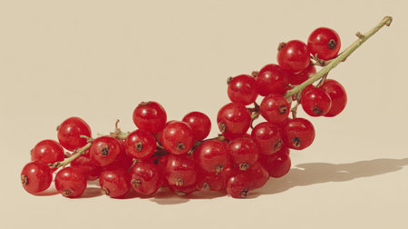 A beautiful arrangement of fresh red currants on a soft neutral background, highlighting their vibrant color and juicy texture, perfect for culinary use or decoration.