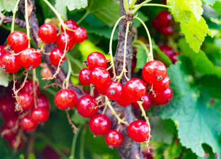 Ribes rubrum berries, red currant on green branch in summer garden