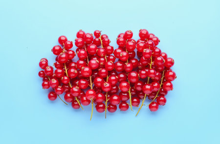 A stunning arrangement of fresh red currants rests on a smooth surface, showcasing their glossy texture and vibrant color against a soft blue background.