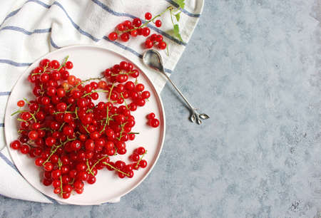 Plate of fresh currant over wet gray background. Flat lay concept.
