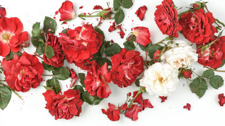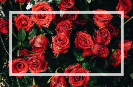 Background with a floral pattern of natural fresh red roses. view from above. A festive banner.