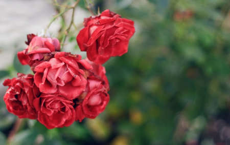 Beautiful old withered red roses on green meadow field grass. Copy space. Selective focus.