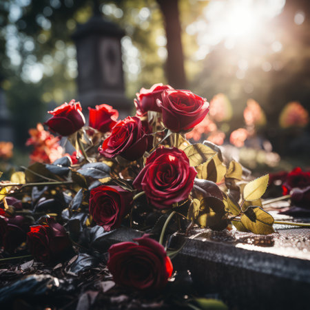 a greeting card with a top-down visual of a stunning red rose bouquet on a dark stone surface. The contrast between the rich red roses and the dark backdrop enhances the emotional impact