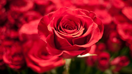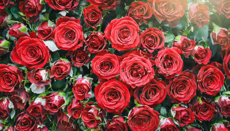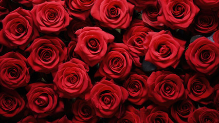 Close-up of vibrant red roses in full bloom, romantic floral background. Love and valentine concept