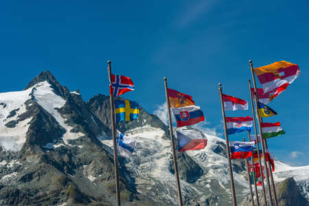 national flags at grossglockner mountain in austria - hohe tauern