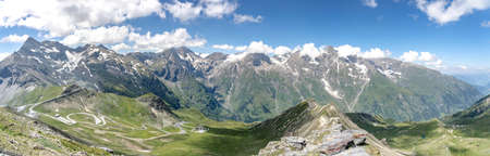 Tranquil summer Alps mountain and serpentines of Grossglockner High Alpine Road. Two shots stitch image.