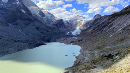 Mountains around the glacier of Pasterze as of summer 2018 on the Grossglockner range in Austria. Visible decay or dissolution of glacier due to global warming or heating of environment.