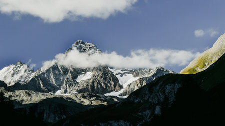 Stunning view of high mountain peaks and glaciers in the italian french alpine arc, in a cloudy day of springtime. Melting snow on the slopes. Morning soft light.