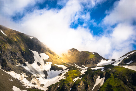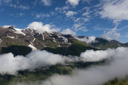 Beautiful view of Alps mountains. Snowy peaks in clouds. National Park Hohe Tauern, Austria. Grossglockner high alpine road.