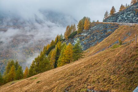 Grossglocknerstrasse, Austrian Alps. Dizzy turns of mountain serpentine. Cold cloudy day in the mountains. Snow melts. The concept of active, ecological and photo tourism