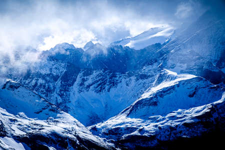 Snowbound summits of Alps mountains on Pasterze Glacier. Grossglockner, Austria. Blue sky with clouds.