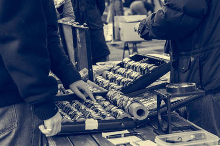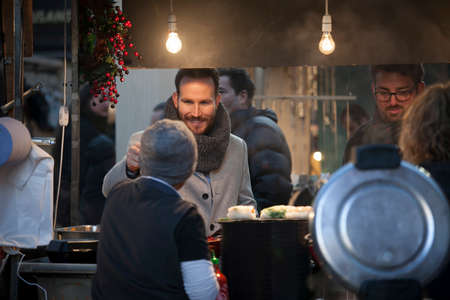 Customer receiving serving at food stand. Street food photography.